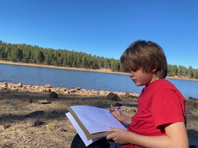 Monday — We visited Dogtown Lake with the Boys (I know I was just talking about a shortage of water.. but the Lake legitimately used to be MUCH wider). Rawls made a natural ring toss, the boys ran out a lot of energy and then spent their “art class” drawing scenes of the lake.