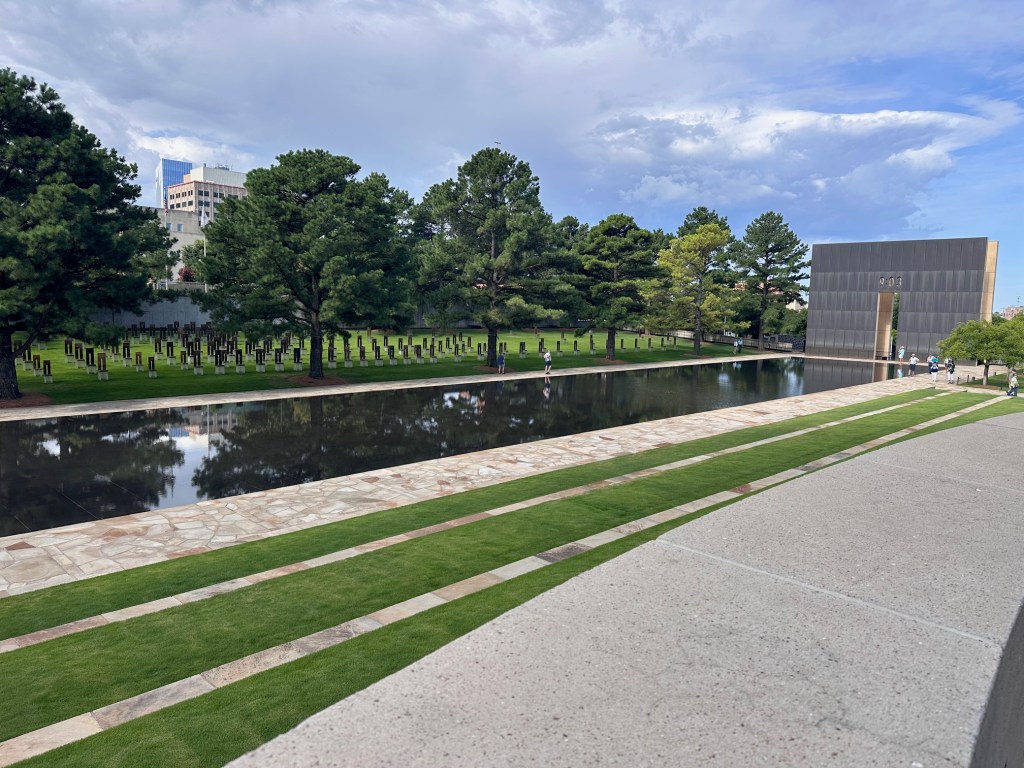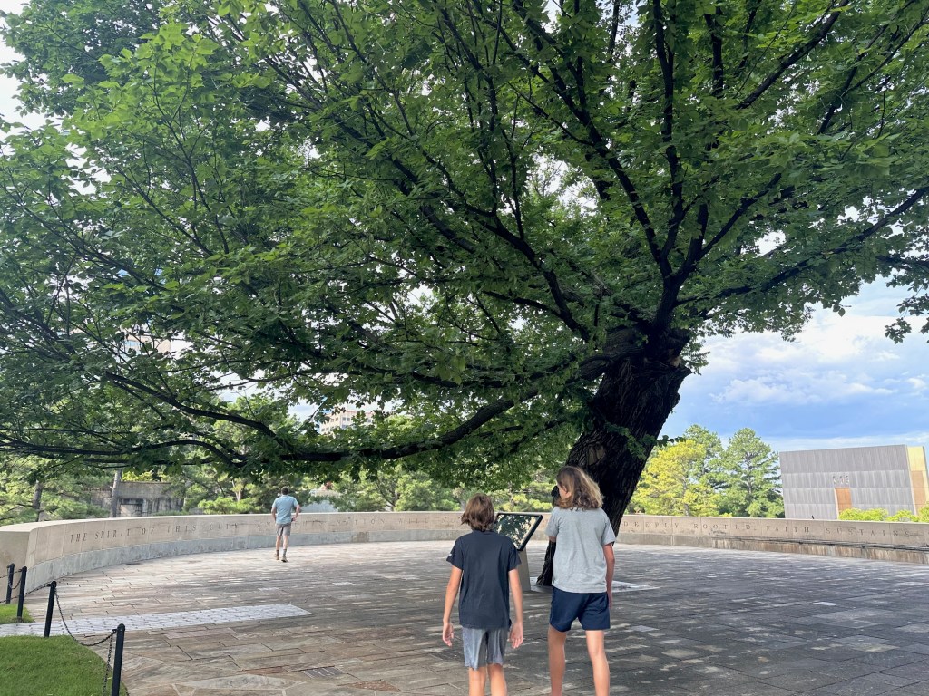 In the morning, we visited the Oklahoma City National Memorial remembering those who died in the 1995 domestic terrorism attack of the Federal building. The memorial was incredibly moving – it flanks the location of the prior building with 9:01 and 9:03 captured on each side – illustrating the impact of the damage that happened at 9:02 on the day of the attack. There are 170 seats facing the space, sized for adults vs children recognizing these seats are missing from the respective family dinner tables. The boys appreciated the survivor tree, the elm that withstood the attack and is recognized as a symbol of the good that can withstand such a terrible act.