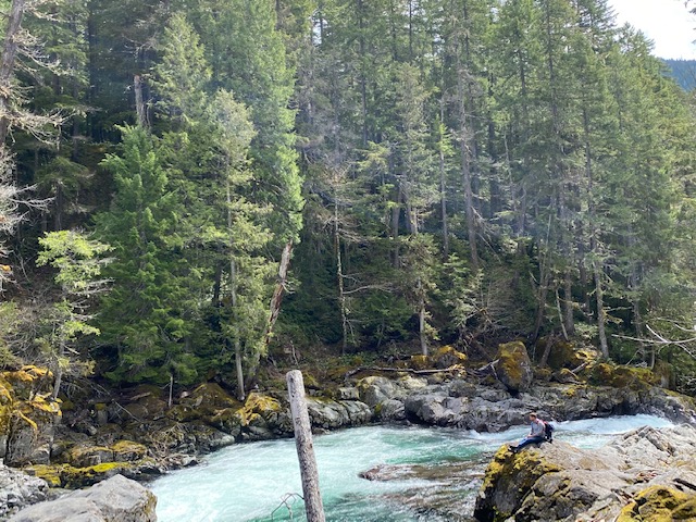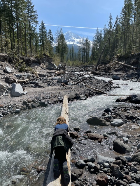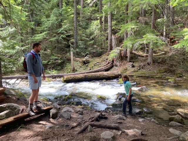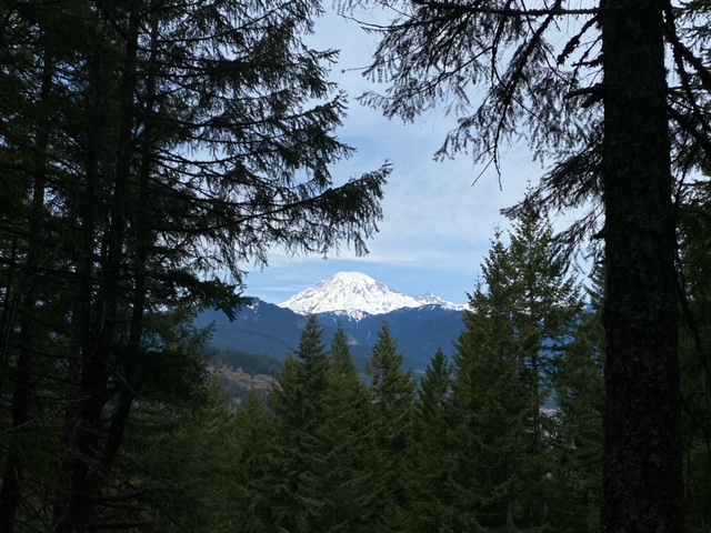 The next day, was about finding a good vantage point to see Mt. Ranier. Instead of going into the park, William found a trail in Pinchot National forest that has a great observation point – Dry Creek trail. The trail itself was subject to more downed trees than in the park and when we got started, one of those had been setup as a bridge.