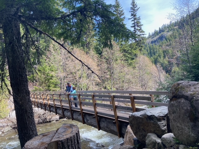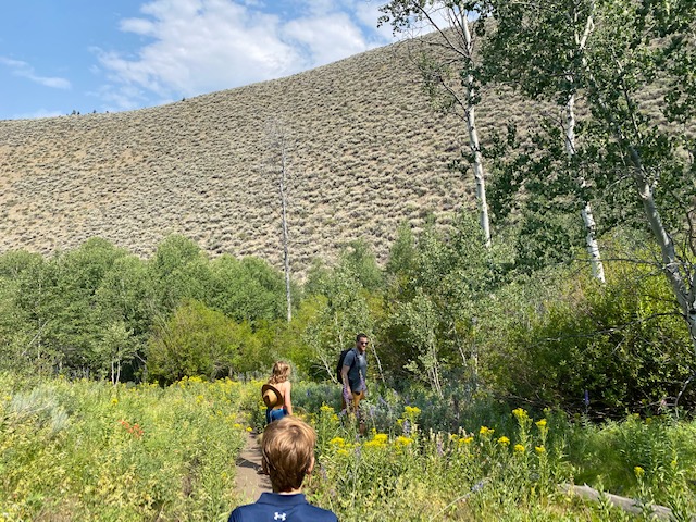 The next morning, after another nice breakfast @ Limelight, we made our way to the Proctor trail – the site of the first chair lift in the world. The hike was beautiful, lots of wildflowers and beautiful landscape. Instead of beginning at the trailhead, we visited the Hemingway memorial and started the hike down from there. Slight addition to the hike, but much easier parking. We did run into a tricky situation at the very top of the hike where we were swarmed by bugs — we all moved as quickly as possible to start our descent and get away. Rawlings is still talking about all the bugs. A pretty creek at the bottom was a great spot to rest briefly on the way out.
