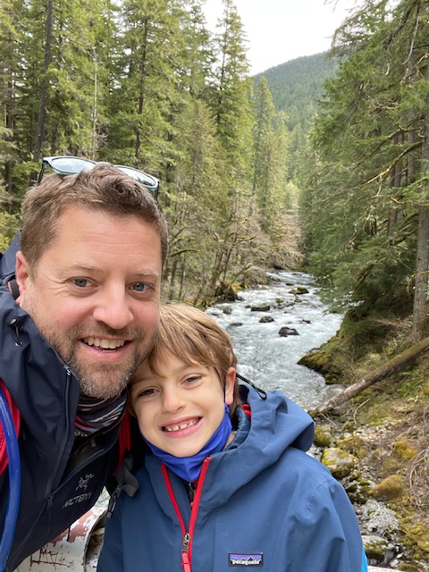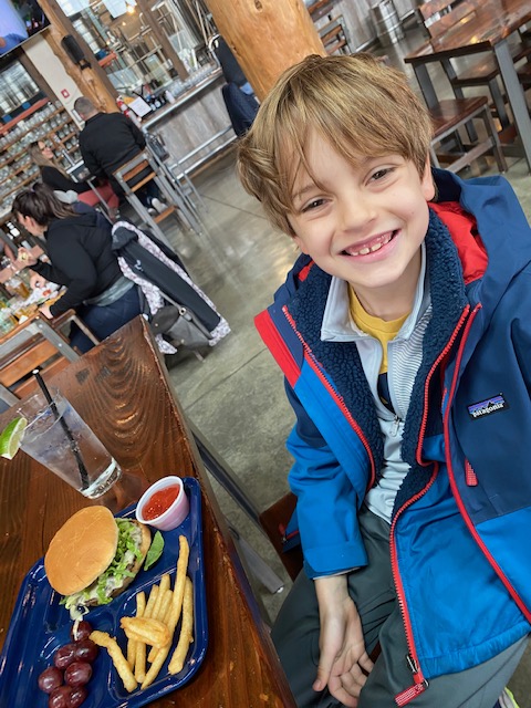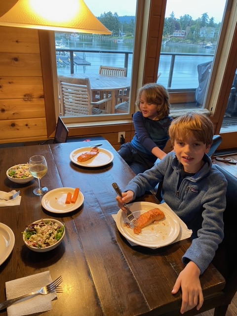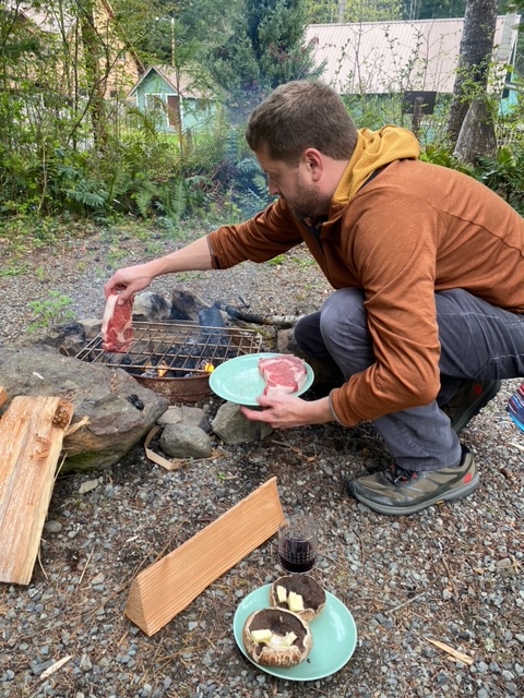 We came back to the cabin, enjoyed the hot tub and rested for a bit. Our plan was to go to what we’d heard was the best burger spot in all of Washington (per Yelp and USA Today and everyone you ask around here) – but Cliff Droppers was closed upon arrival. Amazingly in this year of unpredictable times, this is the first time we’ve shown up somewhere to find it closed. So we taught the boys the word “pivot” – visited the grocery for steaks/Bellas/mashed potatoes and William is currently cooking things out here:
