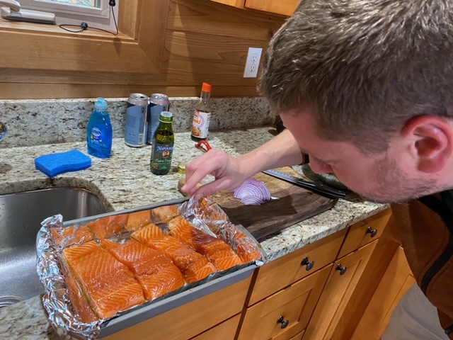 Cozied up and cooked dinner together at the cabin / salmon (steelhead and amaze!), salad and potatoes. Something simple after last few days was perfect.