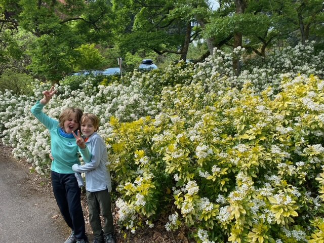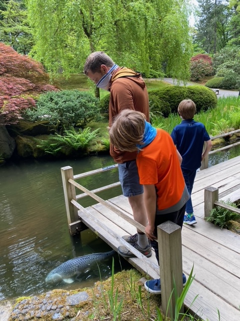 After the farmer’s market we went to Hoyt’s arboretum — 18 miles of trails divided into sections devoted to various tree families. We walked the firs, spruces, oak, magnolia and birch areas. Fully an area that would have been fun to visit multiple times. Last photo here you can see the boys were really at each other