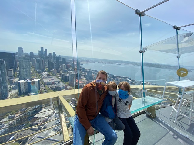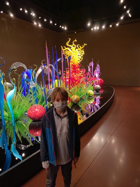 After lunch at “boys choice” Zeeks pizza, it was time to visit the Space needle and Chihuly glass and gardens. The history of the Space needle was presented as you walked to the elevators. At the top, Shepherd discovered he was not loving the heights and especially the glass, rotating floor.