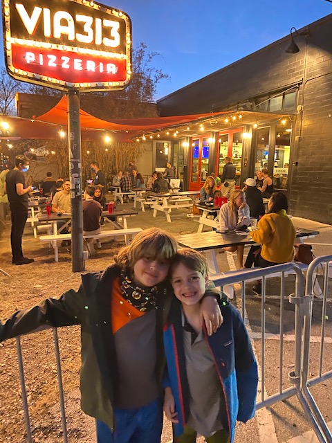 Tuesday the boys spent a bunch “PE” time in parks and we walked to another east Austin lunch location – Cenote. That night we walked along a fun Austin bar scene // lots of front porches, some live music and mostly 21 and up (so we just looked :). We watched the warm up for a band (first “live” music in a year?!) but had to head to our dinner spot before they started. S enjoyed venmo-Ing a tip. Loved loved our dinner at Emmer & Rye. The boys were incredibly adventurous eating everything from umeboshi, to grilled cabbage and orange butter, and the amaze homemade pastas/cacio e pepe is one of their specialties. Rivaled FIG in Charleston for “best family dinner”.