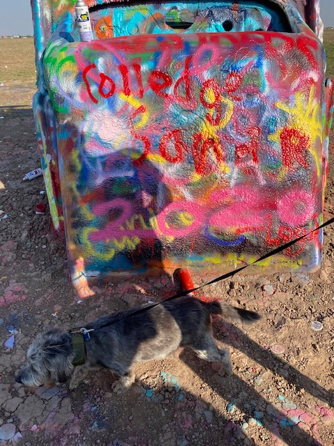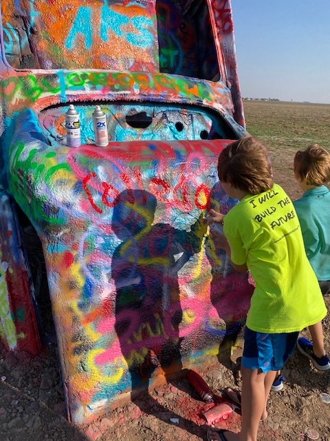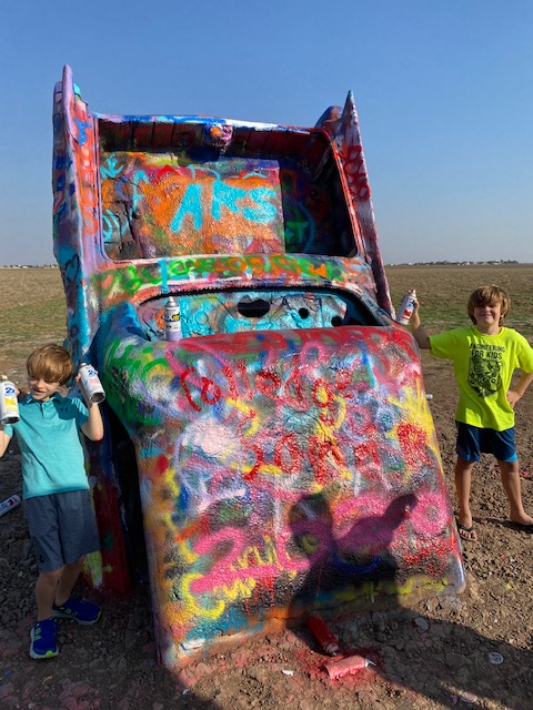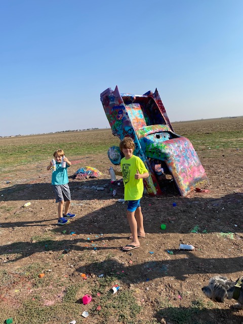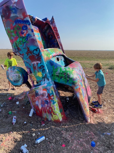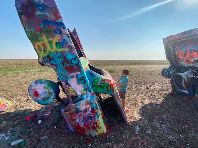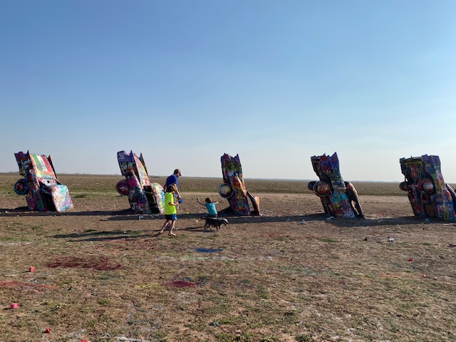 After getting our things settled in the hotel, we visited the Cadillac Ranch, a public art installation funded by Amarillo-native, Stanley Marsh. The installation consists of 10 Cadillacs sunken into the ground. The cars involved ranged from ’49 to ’63 models and supposedly are meant to represent the rise and fall of the Cadillac. The fun of the installation is that you can bring, buy or find abandoned spray paint cans and become a contributor to the installation. The personal contribution may only last a day or so, but we had fun joining in. As we arrived, there were two trailers flanking the entrance selling spray paint, one covered in Trump 2020 flags and the other in Pride/rainbow flags — even the entrance to this remote art installation laid out our current cultural division (not a tough guess as to where we purchased spray paint 😉